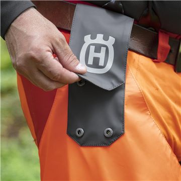 Husqvarna Regnbyxholk Functional erbjuder yrkesfolk och utomhusentusiaster en praktisk och hållbar lösning för regniga arbetsdagar. Tillverkade av polyestertrikå med en ensidig PU-beläggning, garanterar dessa byxholkar inte bara starkt skydd mot väta utan är också lätta och tysta vid rörelse. De svetsade sömmarna förstärker vattentätheten och den enkla designen gör att de lätt kan fästas vid ett bälte eller verktygsbälte.